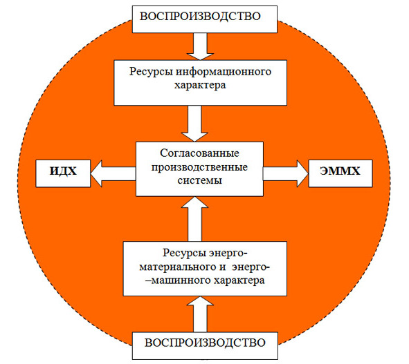 «Воспроизводство» на схеме – это Решения (управляющая информация) по воспроизводству с дополнениями по необходимому развитию. Оно может быть простым (консервативным), расширенным (по количеству и широте распределения продукции) и прогрессивным (по характеристикам продукции относительно потребностей Потребителя и общественной полезности). Результаты общественного производства выливаются в энерго-механические и материальные характеристики общества (ЭММХ) и в информационно-деятельностные характеристики (ИДХ), то есть в его Потенции относительно окружающего мира и собственных основ существования (геопространства с экосистемами, Тела, общественного сознания и животворного содержания). Согласованные производственные системы это, прежде всего, системы специализированных, отраслевых производств, согласованные по материально-техническому, информационному, энергетическому и человеческому обеспечению, по многим Нормам и Правилам. Человеческие ресурсы входят как в энерго-машинные, так и в информационные ресурсы. К энерго-материальным ресурсам относятся и природные ресурсы агро-технического и других производств, получаемые от естественных производств, использующих энергию солнца и многих органических соединений [17]. Результаты общественного производства должны обеспечивать общественно полезное развитие всех граждан в наибольшей функциональной полноте, то есть в наибольших потенциях, заложенных в их генотипах. Это аксиома Предписания, достаточно проверенная опытом Советского Союза и других стран.