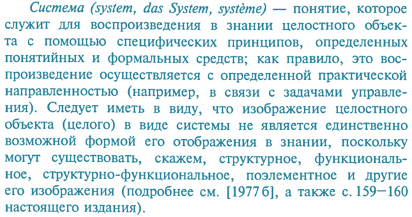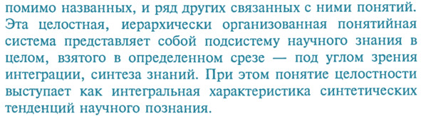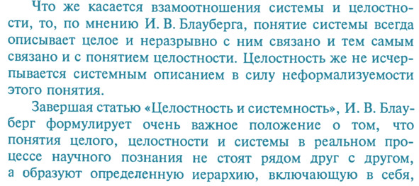 Понятия целого, целостности, системы и системного подхода глубоко разрабатывались в конце 60-х – начале 70-х годов советскими философами: А. А. Малиновским, – сыном А. А. Богданова (Малиновского), И. В. Блаубергом и другими [19—22;]. Среди соответствующих публикаций надо выделить издания избранных работ Блауберга и Малиновского [22; 103], в которых, кроме авторских сочинений, опубликованы Предисловия о жизни и творчестве этих выдающихся исследователей и, соответственно, о (не) развитии «тектологии» и системных исследований в СССР. В большом Предисловии к избранным статьям И. В. Блауберга приведено определение им ключевого понятия и другие важные по теме статьи понимания: