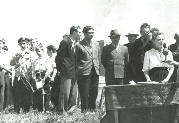 Торжественная линейка пионерских дружин. Слева Н. Бабич, В. Емельянов, выступает К. Лукьянюк
