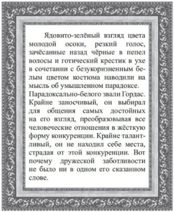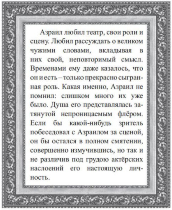 – Ты не горд, ты таланту своему давно определил место: где-то среди второстепенных ролей, а то и вовсе – эпизодических, ты не горд, значит, ты слаб, ты не в силах быть Азраилу соперником. Но ты умен, даже слишком. Итак, решение умного человека – быть ему другом, – с мрачной торжественностью заключил он.