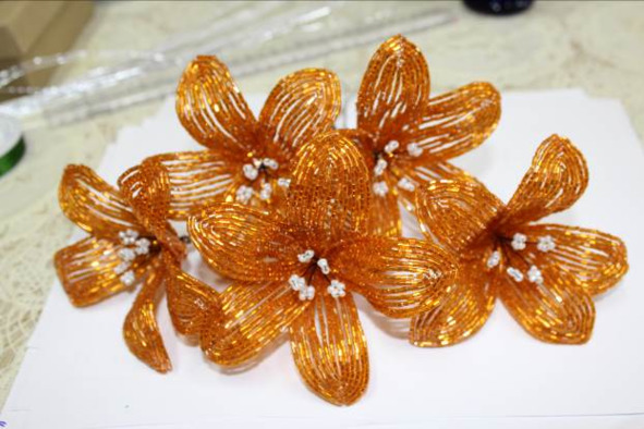 Материалы: оранжевая рубка, проволока (розовое золото) 0,4, проволока 0,7 (серебро), бисер номер 6 (белый)