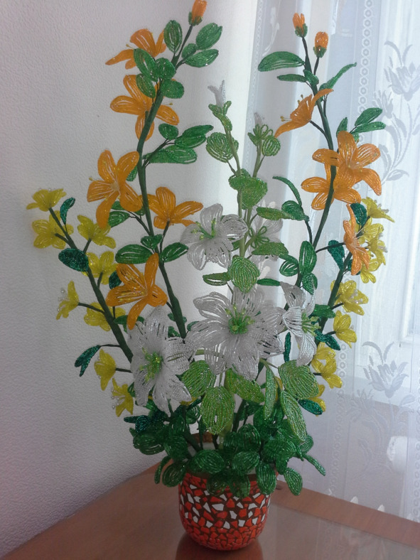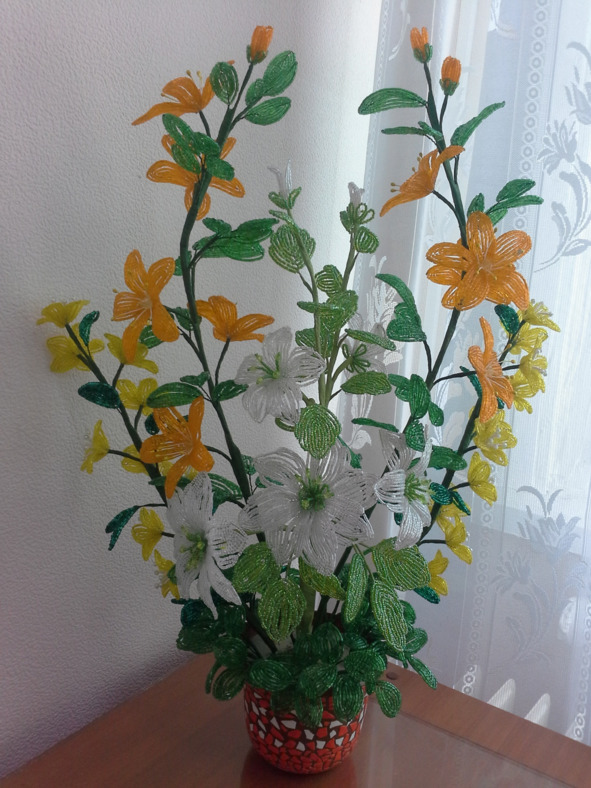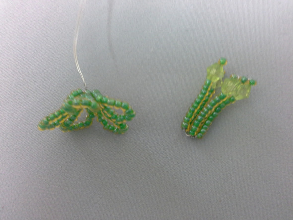 Материалы: жёлтая рубка – 50 гр., тёмно-зелёный бисер и зелёный по 30 гр. (смешать), белый бисер – 10гр. (тычинки), 120 бусин 4мм. (жемчужные) для тычинок, рубка прозрачная – 50гр., 2 оттенка светло-зелёного бисера – 30 гр., зелёная рубка – 100 гр., оранжевая рубка – 50гр., тычинки – 27 пар, 9 жёлтых прозрачных бусин 5—6 мм., проволока для плетения, тейп-лента зелёная и светло-зелёная, проволока для стебля алюминиевая.