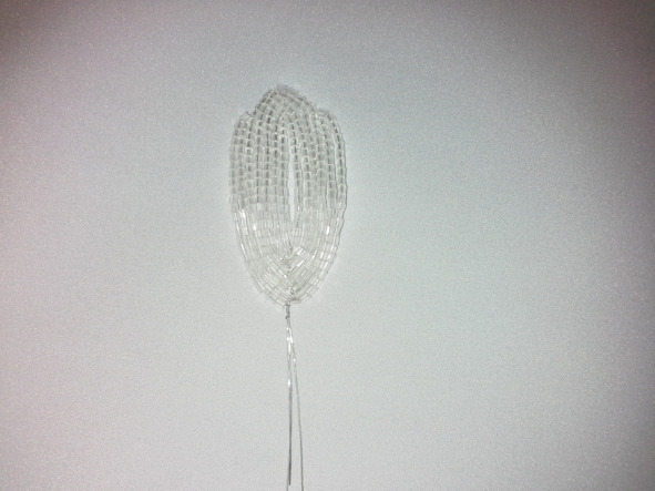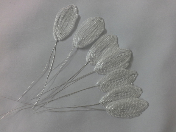 Из прозрачной рубки плетём большие лепестки в технике французского плетения листа, на центральную ось набираем 15 рубок, плетём 6 пар дуг. В последней паре дуг плетём зубчик, таких лепестков нам понадобится 21 шт.