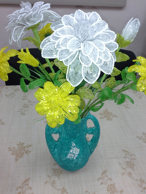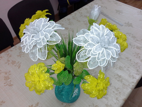 Материалы: рубка жёлтая 50 гр., бисер зелёный 30гр., проволока для плетения, проволока для стебля, тейп-лента, пластиковая папка. Из жёлтой рубки плетём лепестки в технике французского плетения листа: 15 маленьких (на центральной оси 10 рубок и 3 пары дуг), 6 больших (на центральной оси 10 рубок и 4 пары дуг). На один цветок нужно 15 маленьких и 6 больших лепестков, плетём заготовки на 6 цветков. И 12 лепестков для бутонов по 6 лепестков на каждый бутон.