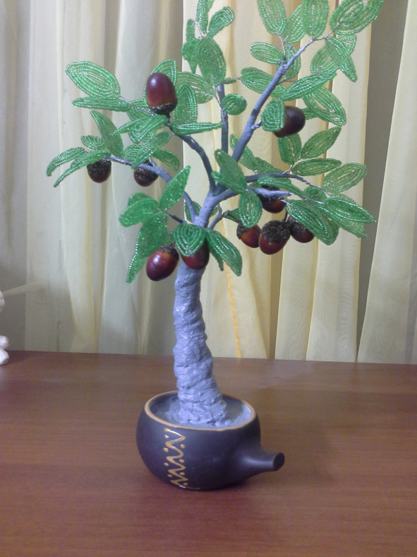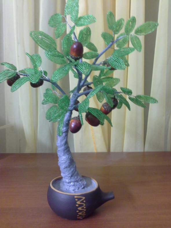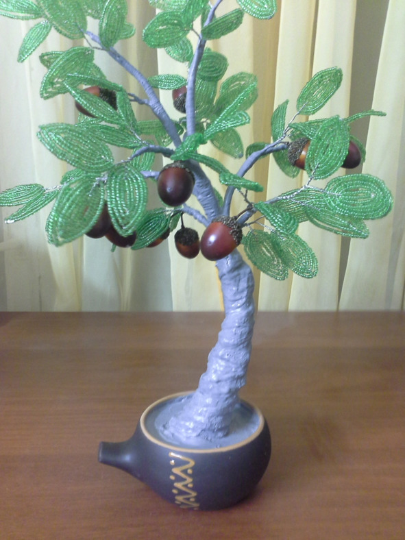 Материалы: Бисер зеленый 50гр., гипс, гипсовый бинт, кашпо или маленький горшочек, желуди пластиковые 2—2,5 см 10шт.