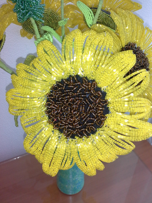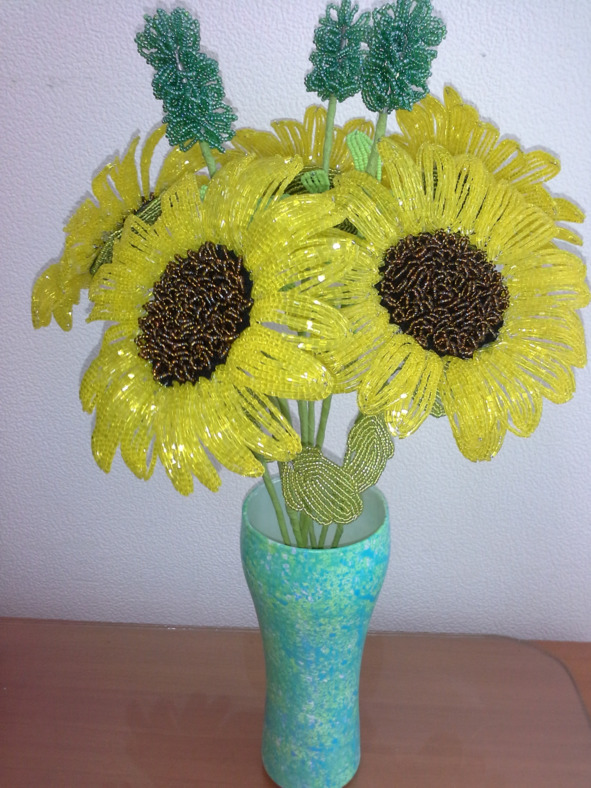 Материалы: рубка жёлтая 50 гр., бисер коричневый 30 гр., проволока для плетения 0,3 мм., проволока для стебля 5мм., зелёный бисер 30 гр., тёмно-зелёный бисер 30гр., зелёный матовый 20гр., вазочка, пластиковая папка.