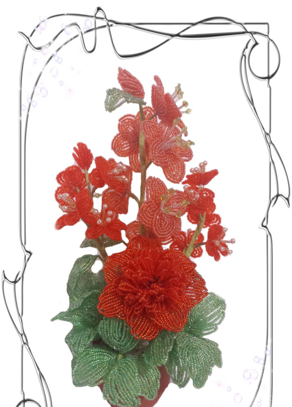 Материалы: зеленый бисер 100гр., 3 оттенка оранжевого бисера по 30гр., белая рубка 10гр., прозрачно-бежевый бисер 10гр., жемчужные бусинки 45 шт. (3мм.), граненые бусинки 30шт. (4—5мм), зеленая тейп-лента, проволока для стеблей 1 и 4мм, горшочек или маленькое кашпо высотой 5—6 см.