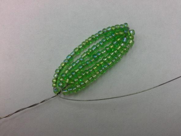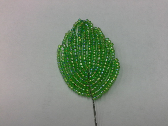 Начинаем плести зеленые зубчатые листья в технике французского плетения листа, центральная ось 15 бисеринок и 7 пар дуг. Всего нам понадобится 40 листиков: