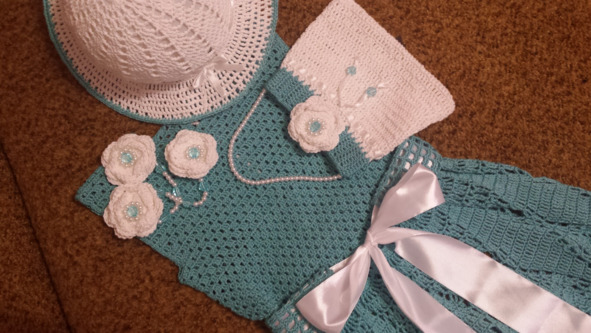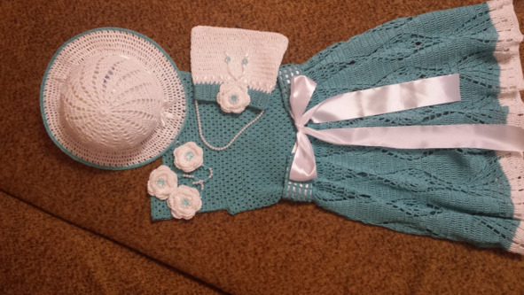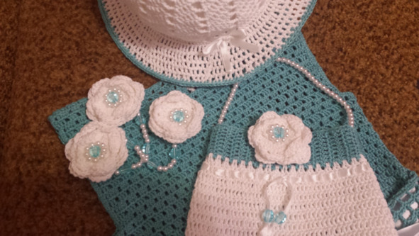 Материалы: Пряжа Нарцисс 100% мерсеризованный хлопок, 395 м, 100 гр. (цвет бирюза). Пряжа Фиалка 100% хлопок, 225 м, 75 гр. (белая). крючок 1,75 и 1,5, регилин белый, бусины для украшения.