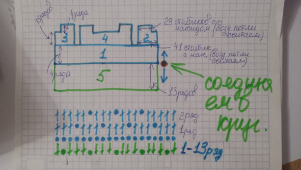 Начинаем вязать, на фото, на рисунке отмечены цифрами этапы работы. Вяжем с середины, на фото обозначено оранжевой точкой. Вяжем по схеме, она дана на фото, вяжем то что под цифрой один, после часть где цифра два и так далее, талия отмечена зелёным цветом.