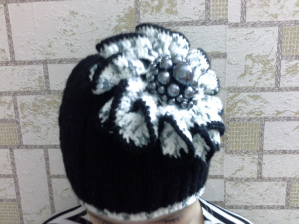 Материал: спицы 2 мм., пряжа из Троицка Кроха (135м/50г) или аналогичная черная и серо-белая, бусины 6мм. – 21 шт., 10мм. – 7 шт., 20 мм. – 1 шт.