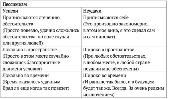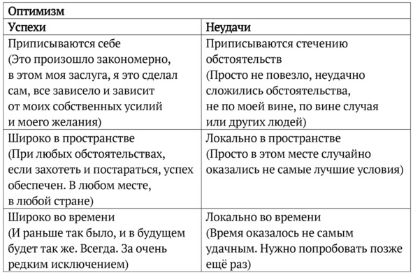 Оптимистичные люди склонны приписывать неудачи случайному стечению обстоятельств, случившемуся в определенной точке пространства в определенный момент времени. Успехи они привычно считают личной заслугой и склонны рассматривать их как то, что случается почти всегда и почти везде.