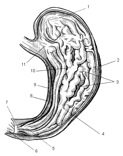 Рис. 1. Строение желудка: 1 – свод; 2 – большая кривизна; 3 – складки слизистой оболочки; 4 – синус; 5 – пилорический отдел; 6 – двенадцатиперстная кишка; 7 – привратник; 8 – пищевая дорожка; 9 – малая кривизна; 10 – тело; 11 – вход