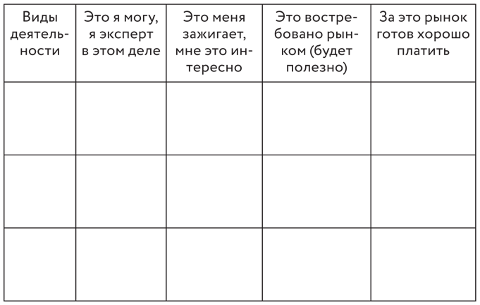 ПРАКТИКАВ первом столбце таблицы перечислите те виды профессиональной деятельности, которыми вы занимаетесь или потенциально могли бы или хотели бы заниматься. Во всех остальных столбцах поставьте плюс или минус в зависимости от того, насколько вид деятельности соответствует заявленному утверждению. Виды деятельности, набравшие плюсы во всех колонках, – это ваши «золотоносные жилы».