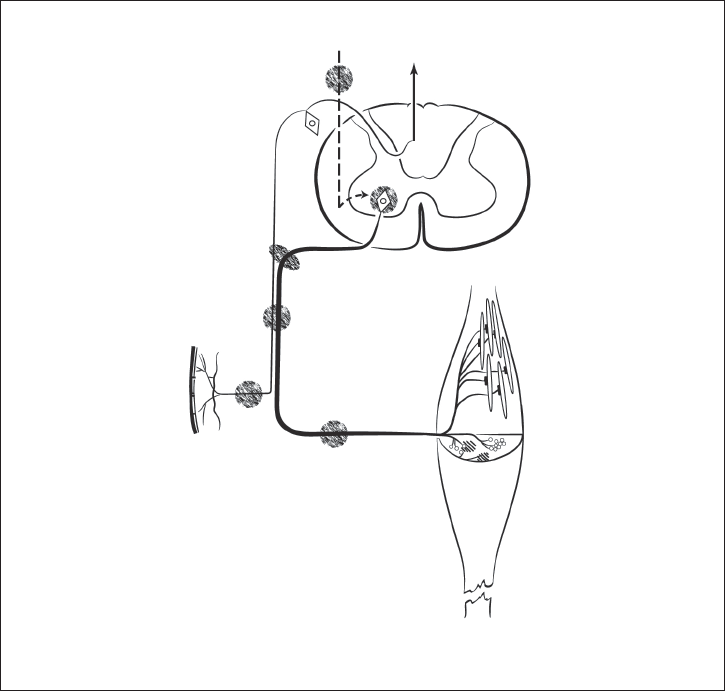• к сухожилию антагониста мышцы (для торможения возбуждения мышцы – антагониста).