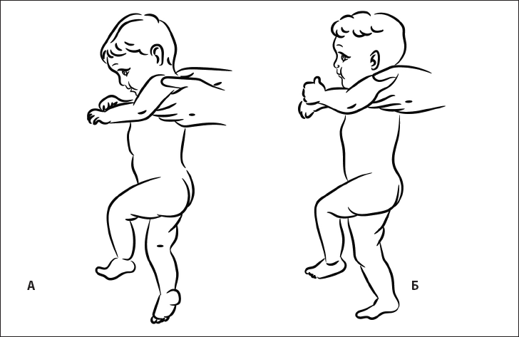 Рис. 25. Шаговый рефлекс, или автоматическая походка. А – норма, Б – отсутствие рефлекса.