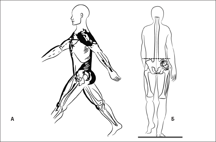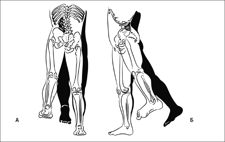 Рис. 42. Экстензия бедра при укорочении квадратной мышцы поясницы (гипотония большой ягодичной мышцы). А – вид сзади, Б – вид сбоку.