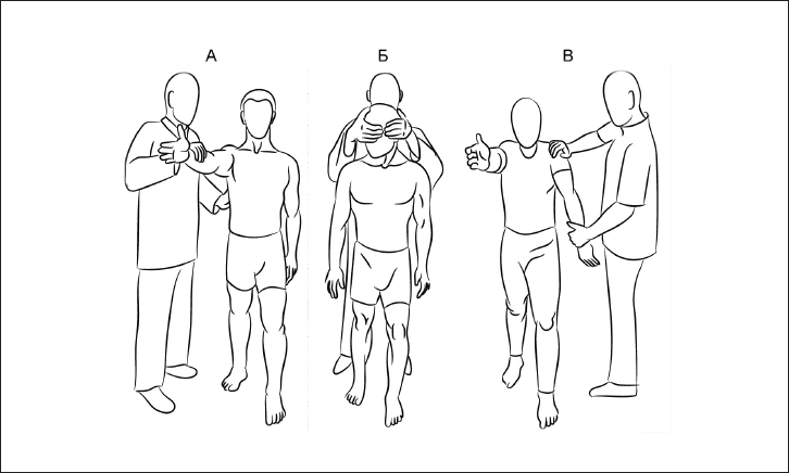 Рис. 27. Мануальное мышечное тестирование мышц флексоров и экстензоров, которые участвуют в паттерне шага для оценки общей неврологической дезорганизации. А – тестирование флексоров плечевого сустава. Б – тестирование флексоров шеи (кивательной мышцы). В – тестирование экстензоров плечевого сустава.