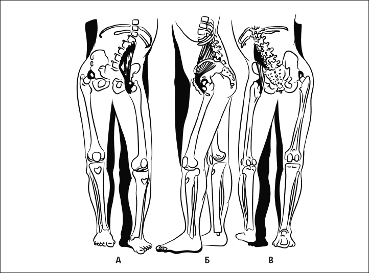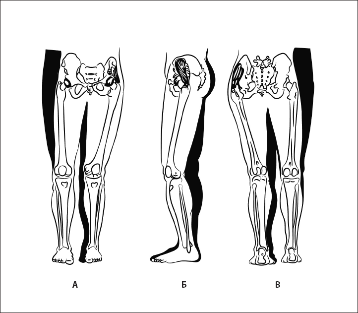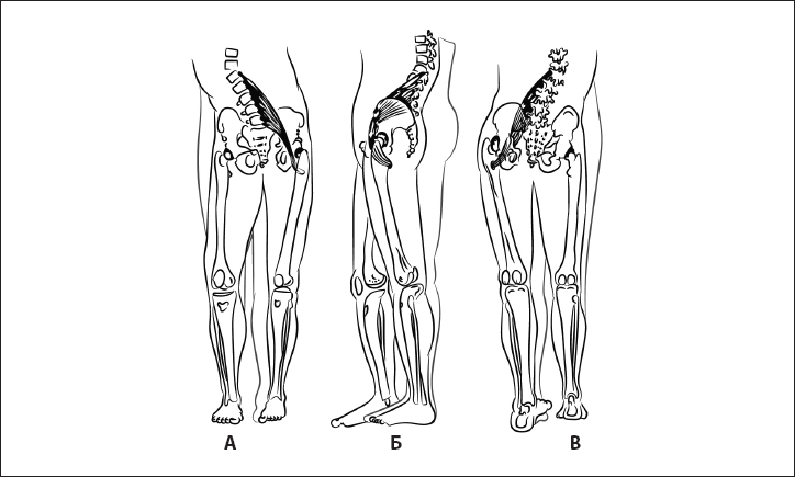 Рис. 32. Укорочение пояснично-подвздошной мышцы. А – вид спереди, Б – вид сбоку, В – вид сзади.