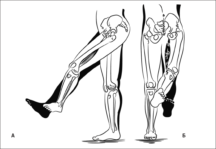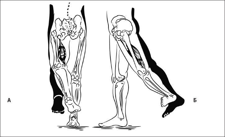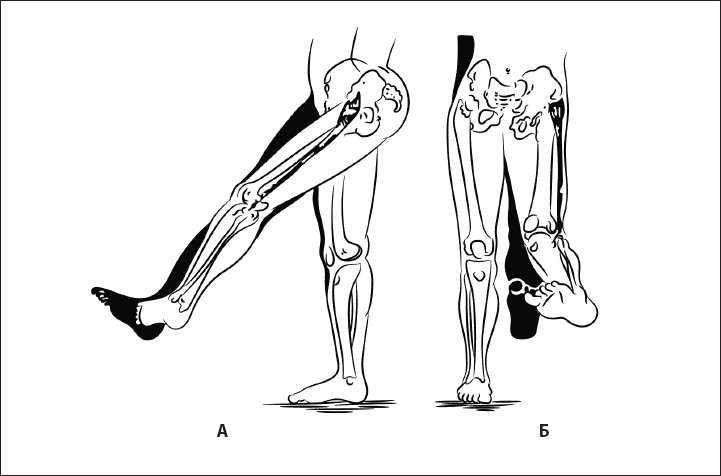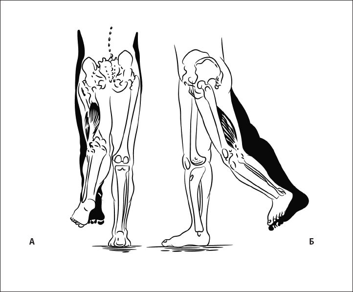Рис. 36. Экстензия бедра с наружной ротацией стопы при укорочении двуглавой мышцы бедра. А – вид сзади. Б – вид сбоку.