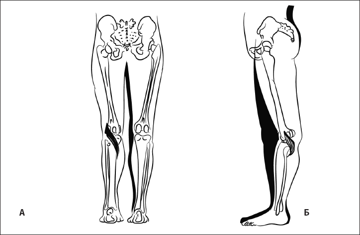 Рис. 33. Флексия бедра и смещение коленного сустава внутрь при укорочении мышцы, напрягающей широкую фасцию бедра. А – вид сбоку, Б – вид спереди.