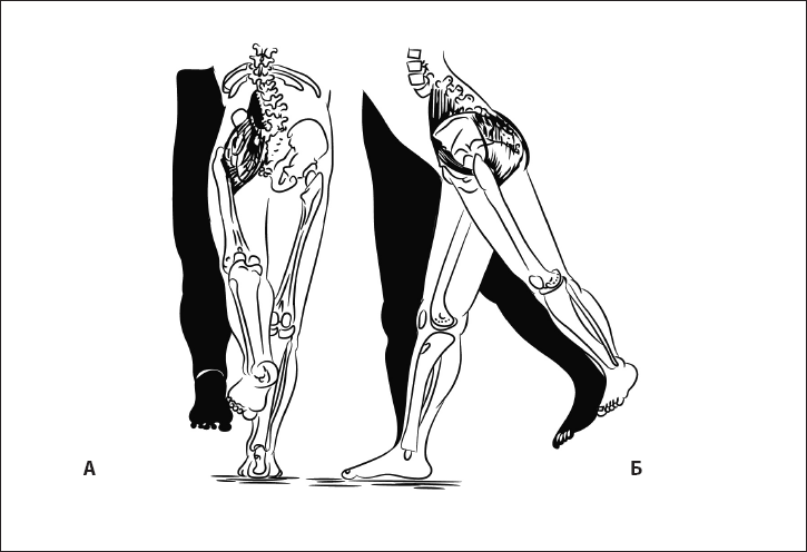 Рис. 26. При правильном формировании паттерна шага туловище разворачивается навстречу ноге, согнутой в тазобедренном суставе (работа косых мышц живота). А – вид сбоку, Б – вид сзади.
