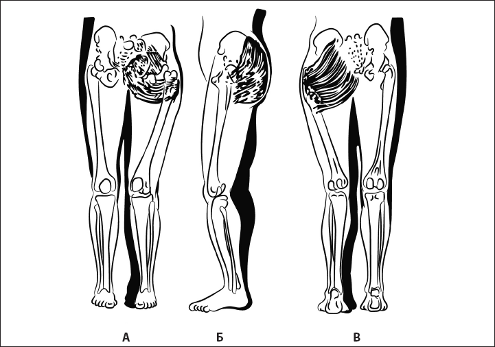 Рис. 43. Гипотония большой ягодичной мышцы. А – вид спереди, Б – вид сбоку, В – вид сзади.