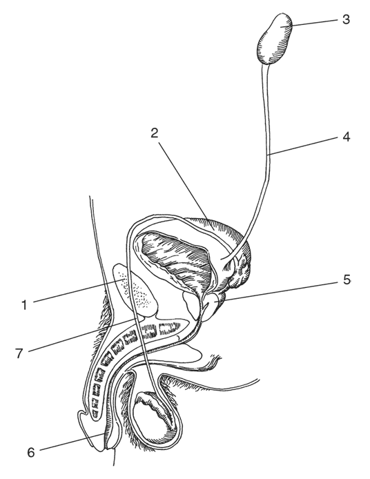 Рис. 2. Мужская мочевыделительная система: 1 – лобковая кость, 2 – мочевой пузырь, 3 – почка, 4 – мочеточник, 5 – предстательная железа, 6 – мочеиспускательный канал, 7 – семявыводящий проток