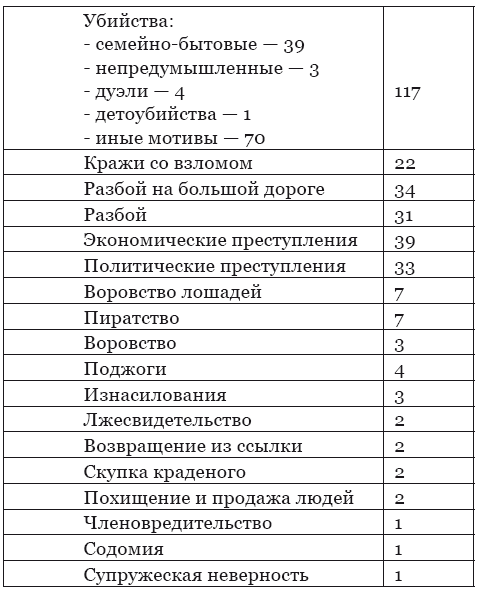 Безусловно, в количественном отношении и в красочности описания в «Календаре» превалируют насильственные преступления, причем значительную долю в их объеме занимают убийства на семейно-бытовой почве, которые в современной криминалистической науке выделяются в самостоятельный вид преступности. По наиболее устоявшемуся и распространённому определению, это «уголовно-наказуемые деяния, посягающие на жизнь, здоровье, половую неприкосновенность, честь и достоинство, а также имущество граждан, являющиеся результатом разрешения конфликта виновным, связанным с потерпевшим семейным, родственным, соседским или дружеским общением»[187]. В силу высокой латентности преступлений данного рода, реальность всегда оказывается далекой даже от официальной статистики, к которой как мы подчеркивали выше, «Календарь» имеет лишь опосредованное отношение, все же отражая универсальные криминологические закономерности. «Если рассматривать всю насильственную преступность, то основную массу потерпевших составляют мужчины… По семейно-бытовым насильственным преступлениям ситуация другая. По результатам исследований, лица женского пола являются потерпевшими в 75,8 % случаев семейного насилия. Например, женщины становятся потерпевшими в 70 % случаев угроз убийством или причинением тяжкого вреда. Так, жертвами таких преступлений чаще всего становятся жены и сожительницы виновных.»[188]. Как мы видим из Таблицы 1, из 117 убийств 39 (33 %) были совершены на семейно-бытовой почве, и в большинстве случаев пострадавшими являлись женщины. В этом плане «Календарь» – уникальный по насыщенности информации источник для анализа гендерных стереотипов, установок, идентичностей, встроенных в историко-социальный контекст рассматриваемого периода. Впрочем, это выходит за рамки нашего исследования, и потому мы ограничимся лишь анализом нескольких показательных биографий, чтобы проиллюстрировать такие криминологические характеристики семейно-бытовых преступления, как его причины, механизм, мотивация, социальные условия, свойства личности преступника и его жертвы.