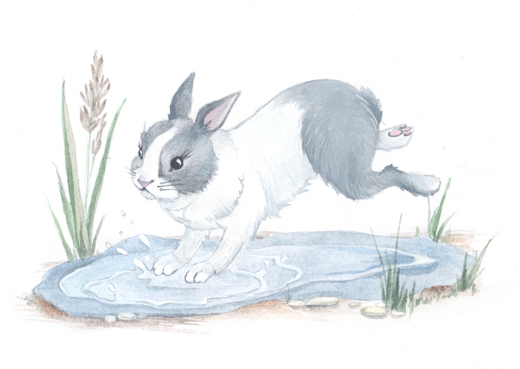 Только озабоченная женщина запустила палку под машину, как кролик выскочил из укромного убежища и резво запрыгал в сторону кустов. Передвигался он так быстро, что не заметил впереди большую лужу. Косой с разбегу прыгнул в неё – и замер от испуга. Бойкий попрыгунчик оцепенел, как будто крепко-накрепко приклеился к луже. Он никогда не видел в своей жизни столько воды и не знал, что ему дальше делать.