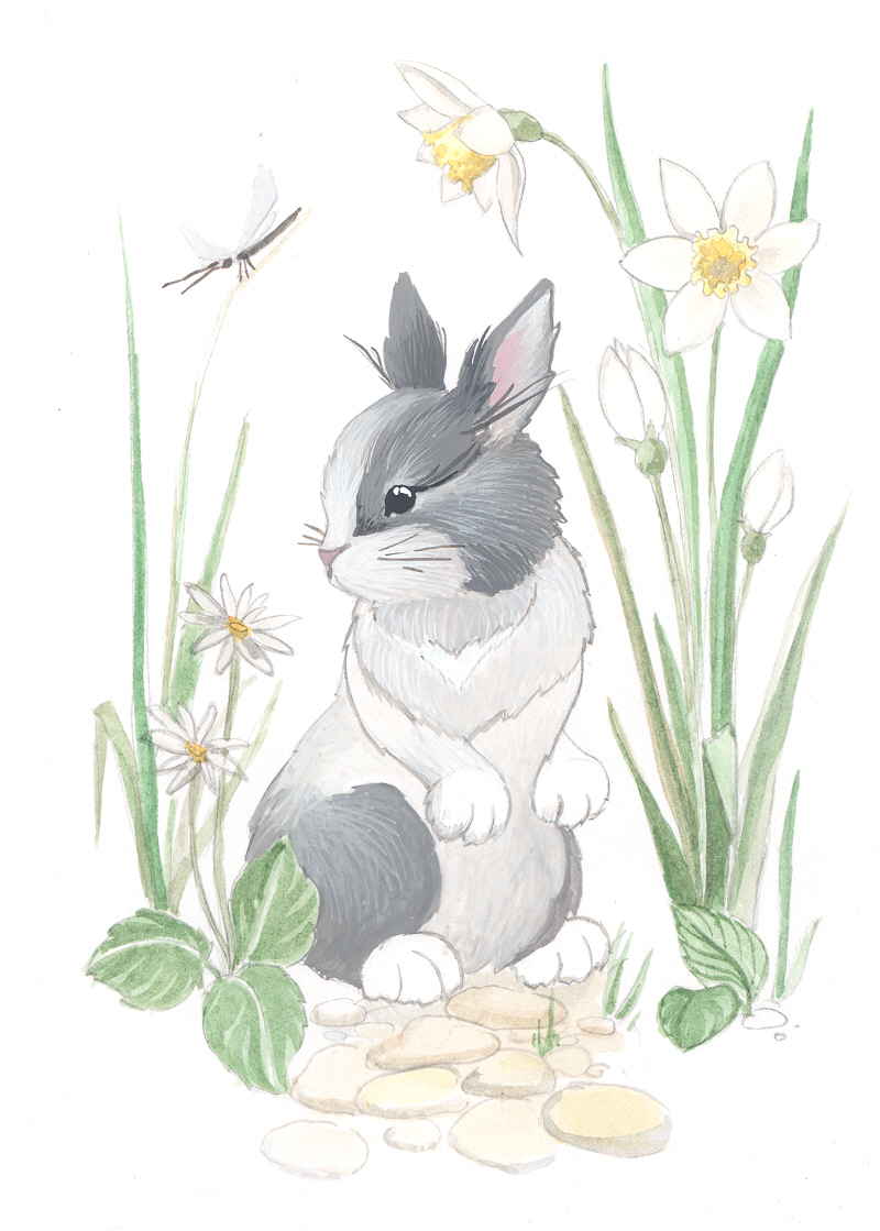 И действительно, маленький беглец сидел в цветнике. Солнечный лучик застрял в его густой шёрстке, и весь довольный вид кролика говорил об одном: «Какая вокруг красота!» Ярко-жёлтые, белые, красные, небесно-голубые цветы окружали его, словно красивая рама картину. Над цветами порхали разноцветные бабочки и стрекозы. Одна из них села на ухо кролика и повисла на нём, будто диковинная серёжка.