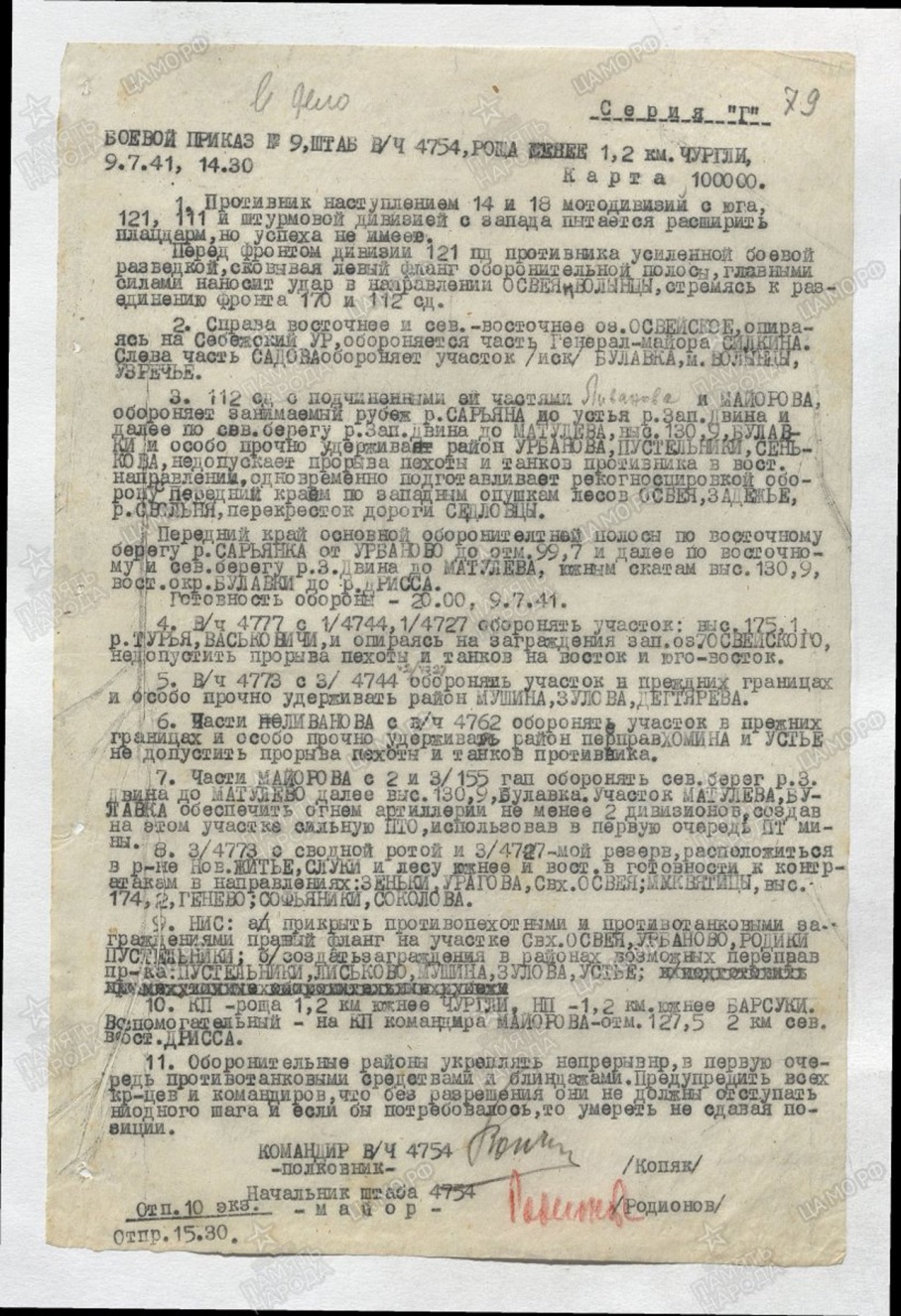 от 9.07.1941 г. об обороне дивизии на рубеже р. Сарьянка