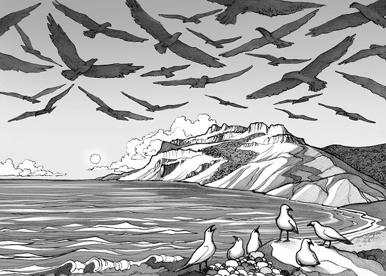 С криком горечи чайки на них свой взор устремили, разом головы подняв в небо ночное. Ничего не поймут возбужденные птицы. Где же звезды? Почему не сверкают?