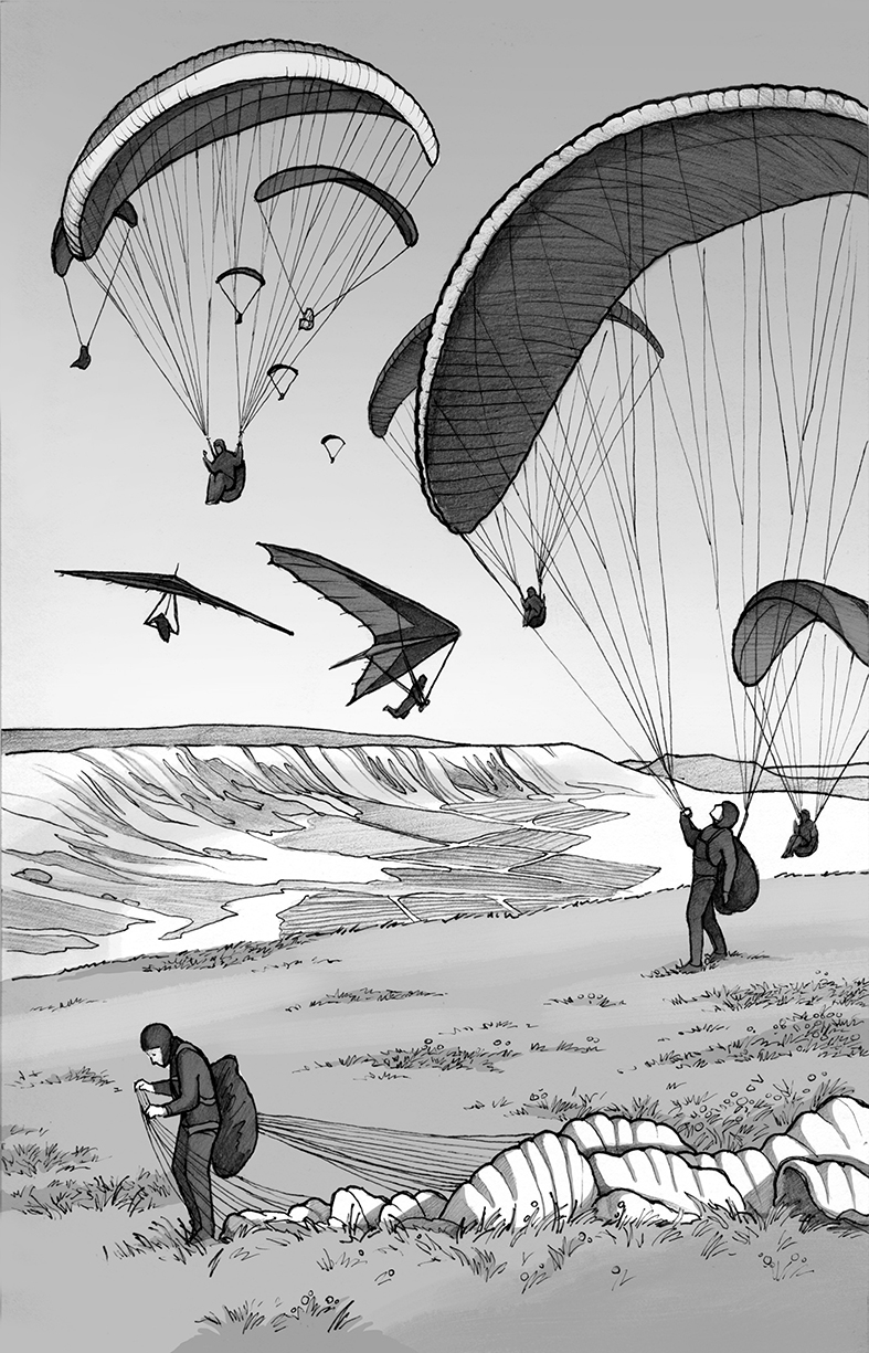 Вот только не стали мы палатки ставить. Достали из рюкзаков и расстелили на земле свои чудо-самолеты. Были это не то парашюты, не то планеры. Пристегнули подвесные системы, дождались встречного ветра. Разбежались и полетели!
