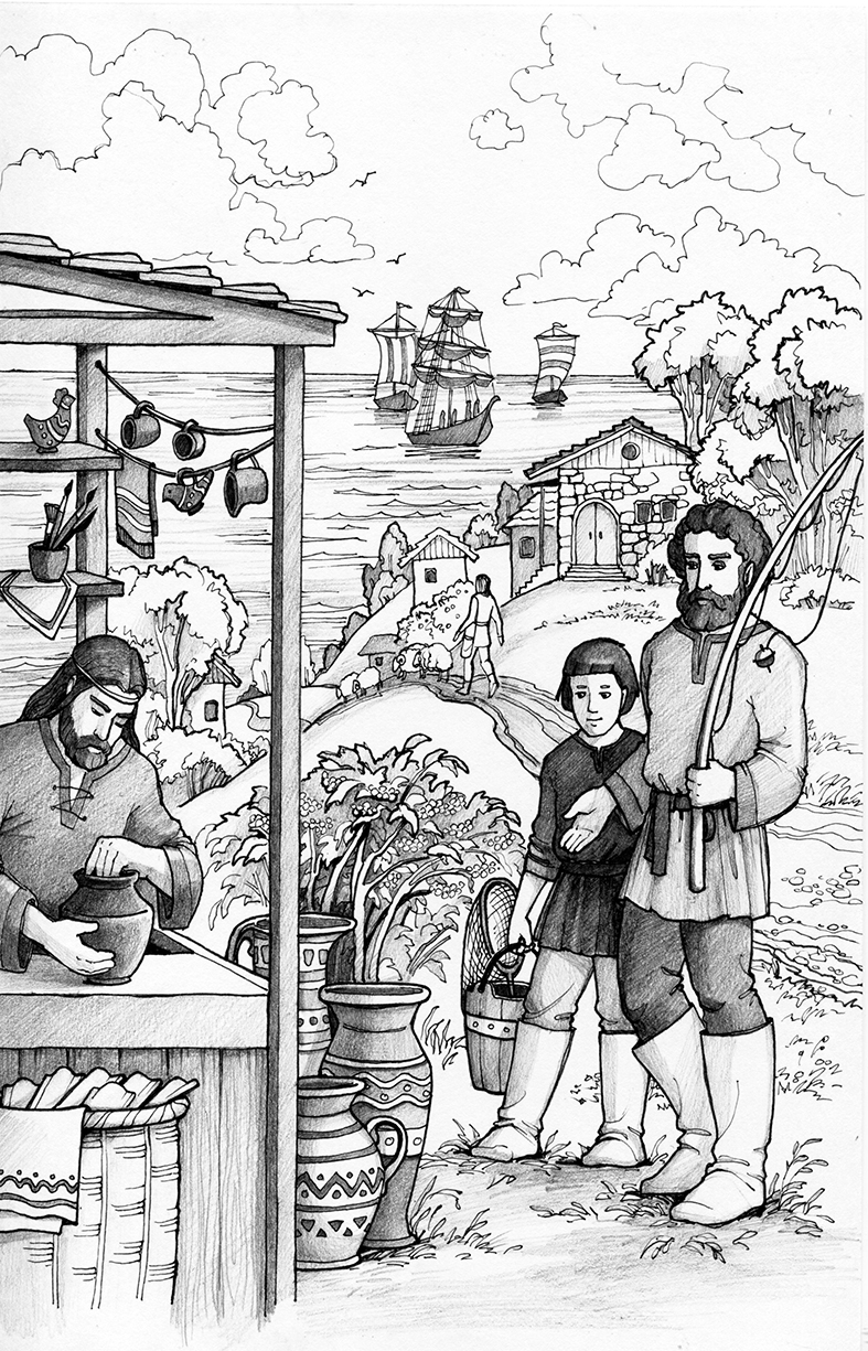 Пошла Ника купаться. Глядит, а на берегу – лодка. В ней молодой красивый юноша. Рассказал он, как еще подростком угнали его разбойники в рабство. Продали на другой берег моря. Но рвался юноша в родные места. Отважился однажды бежать. Сел в лодку и поплыл. Много дней носило его по волнам. Кончилась пища и выпита последняя вода. К счастью, прибило его к берегу.