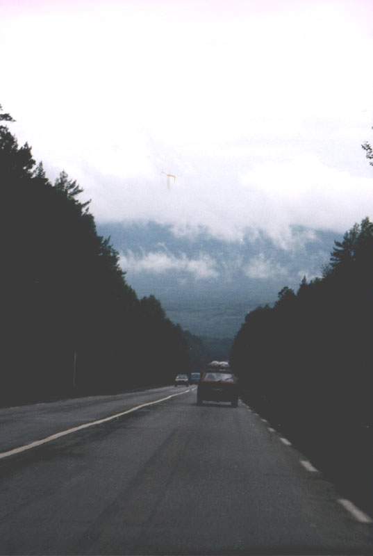Вышли у какого-то придорожного кафе, и безрезультатно стояли на обочине. Рядом остановился красивый московский туристический автобус, только вот ехал он в другую сторону. Куча туристов, высыпавшая на свежий воздух, смотрела на нас с нескрываемым любопытством… они погуляли, поели, загрузились и уехали, а мы всё стопили и стопили… Потом начался дождь, мокрый, холодный. Но надо стоять, чтобы не пропустить «свою» машину, кто её знает, где она бродит.
