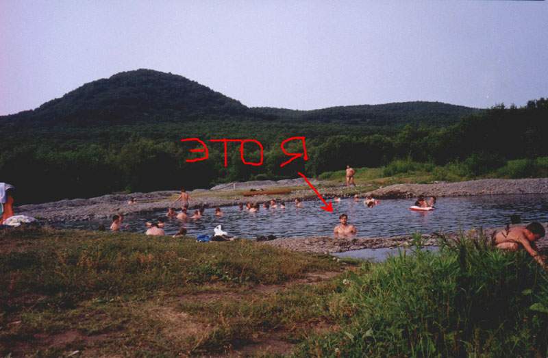 Место для палатки было найдено быстро, и, оставшись в плавках, я отправился изучать, что такое эти горячие источники, и с чем их едят. Температура воды градусов 30-40 С, вода мягкая, так бы там и сидел, глубина почти по пояс, на дне что-то неизвестное, вокруг резвятся дети, а невдалеке группа школьников из Елизово поймала человек 15 датчан и стала засыпать их вопросами на чистейшем русско-английском языке. Жизнь определённо приобрела розовые оттенки. Метрах в десяти бежит чистейшая речка, вокруг нас, создавая уют, сгрудились невысокие, но очень живописные сопки, солнце перестало жарить, и просто начало весело светить. Чтобы запечатлеть эту идиллию, решил сбегать за фотоаппаратом, и через пять минут испытаний на прочность (пришлось метров сто идти босиком по щебёнке), уже искал глазами человека, который помог бы мне в этом мероприятии. И тут как раз подошел какой-то парень. Ура! Теперь есть доказательства, что я тут был.