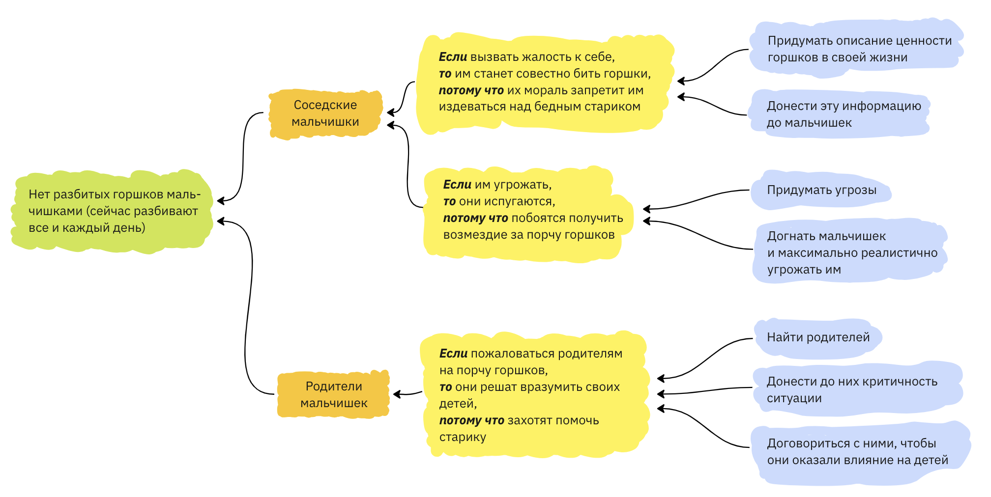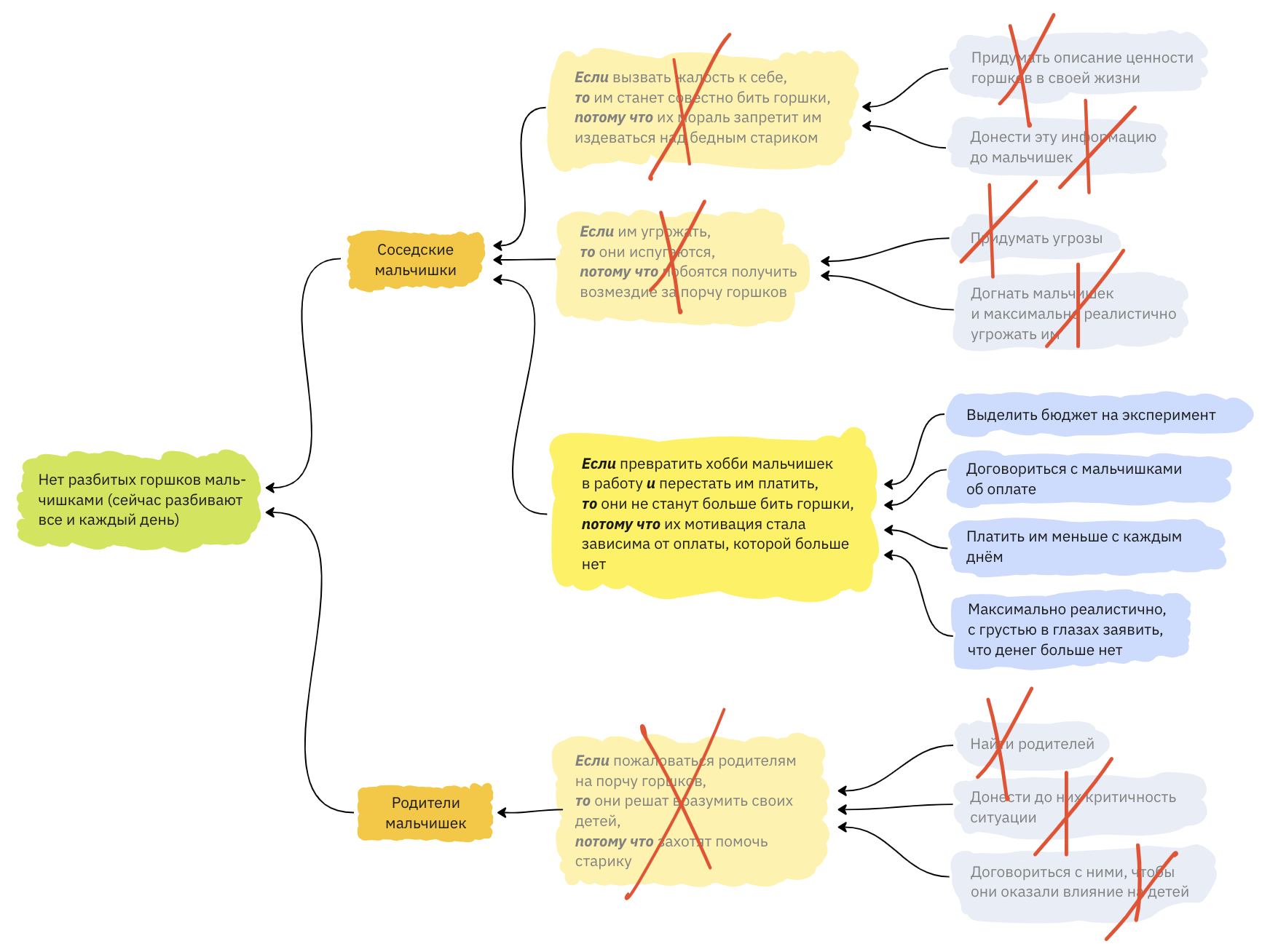 Нужно обратить внимание, что гончар не просто начал раздавать деньги в надежде, что дети перестанут разбивать горшки. Если бы он ни с того ни с сего начал сорить деньгами, сам не понимая, зачем он это делает, то вряд ли пришёл к результату – у него не было бы траектории достижения цели. А в случае когда он придумал идею и понял механику воздействия на мотивацию ребят, раздача денег началась в русле достижения цели через эту идею.