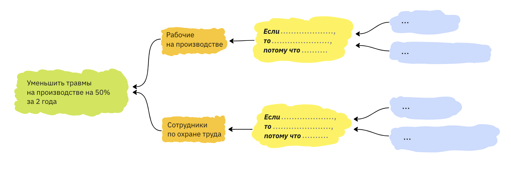 Для того чтобы достичь своей цели, вы собираете начальников управлений служб охраны труда со всей страны на большое совещание, где вы все вместе думаете, каким образом можно достичь цели. Вам нужно сформулировать гипотезы, которые изменят поведение субъектов так, чтобы количество травм уменьшилось. Давайте потренируемся и побудем на месте вице-президента большой корпорации (рис. 6). Попробуйте разработать хотя бы одну ветку от задачи до цели через формулирование гипотезы[14]: