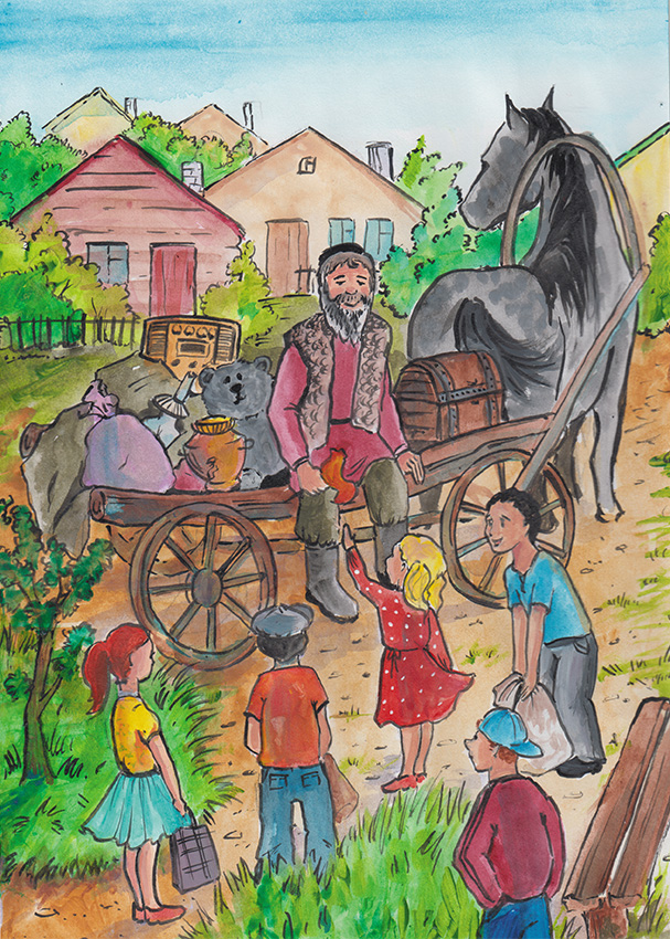 Старьёвщик складывал в мешки различные небольшие вещи, которые ему отдавали сельчане, а крупные вещи клал прямо в телегу.