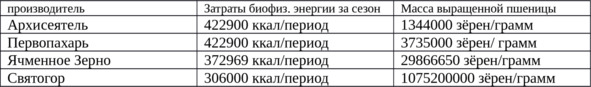За 153 дня весенне – летне – осеннего полевого сезона Архисеятель производительно затратил 422900 килокалорий собственной биофизической энергии, вырасти и собрав при этом 1344000 зёрен/ грамм пшеницы – пятизернянки. За те же самые 153 дня полевого сезона Первопахарь израсходовал те же 422900ккал/период своей собственной биофизической энергии, вырастил и собрал 3735000 зёрен/грамм точно такой же пшеницы – пятизернянки. Соответственно, земледелец, Ячменное Зерно, затратив за 153 дневный сезон 372969ккал/период собственной биофизической энергии, умудрился произвести 29866650 зёрен/грамм пшеницы – пятизернянки. А, Святогор затратив за 153 дня 306000 ккал/период собственной биофизической энергии на производство пшеницы, вырастил и собрал урожай равный 1075200000 зёрен/ грамм такой же пшеницы – пятизернянки.