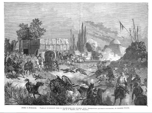 А с мятежной территорией, нужно было что-то решать и в январе 1876 года Кауфман, прибыв в Петербург, добивается у императора Александра II решения на полную ликвидацию Кокандского ханства и присоединения его земель к Российской империи. Тут же в Ташкент была отправлена телеграмма генералу Колпаковскому со следующим текстом: «Снисходя к общему желанию всего кокандского народа принять подданство России, а также, не видя возможности успокоить население другим способом, государь император повелеть соизволил ныне же принять ханство в подданство его. […] Бывшее Кокандское переименовать в Ферганскую область. Начальником области – Скобелев. Наср-Эддина пока в Ташкент». Получив 5-го февраля Высочайшее повеление о присоединение ханства, М. Д. Скобелев совершил стремительный переход к Коканду и на следующий день занял его, 19-го февраля было объявлено о присоединение Кокандского ханства к русским владениям.
