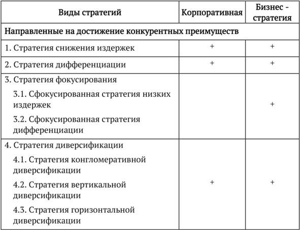 Корпоративная стратегия, объединяющая в себе две последующие, имеет наиболее важное значение, так как предназначена для координации всех элементов системы управления предприятием. Такая стратегия, как правило, носит достаточно обобщенный вид и направлена на удержание устойчивой позиции на рынке. К корпоративным можно отнести следующие стратегии: минимизации издержек, дифференциации, фокусирования.