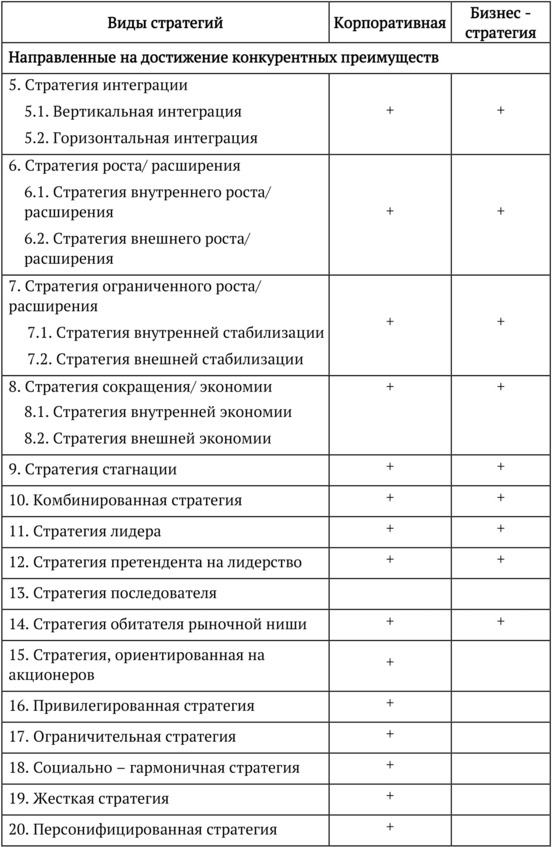 Также к бизнес-стратегиям относятся стратегии различных видов диверсификации (конгломератная, вертикальная, горизонтальная) и интеграции (вертикальная, горизонтальная).