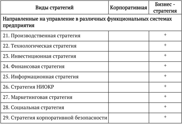 Пятая группа стратегий представляет стратегии функциональные, хотя инвестиционная, финансовая, социальная и стратегия корпоративной безопасности могут при определенных условиях выступать как корпоративные. Предложенная классификация стратегий управления корпорацией, на наш взгляд, наиболее удачно отражает принадлежность рассмотренных стратегий к определённым видам и способствует экономически обоснованному их выбору в силу наглядности представления.