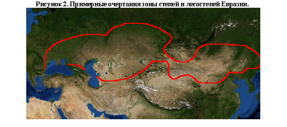 Практически через всю Евразию от Карпат до Сихотэ-Алиня тянется полоса степей. С севера она ограничена лесами, а на юге либо переходит в безводные пустыни, либо упирается в практически непроходимые горы. Примерно в середине степное приволье «перепоясано» северными отрогами Тян-Шаня и Алтайскими горами (рис. 2). На концах этой своеобразной восьмерки степи смыкаются с древними Переднеазиатским и Дальневосточным очагами земледелия, а районе Тянь-Шаня и Копетдага – с Центральноазиатским центром. «В течение весьма длительного времени степная зона служила специфичным базовым „доменом“ скотоводческих культур. Однако „домен“ этот включал в себя также расположенные севернее и экологически существенно более комфортные для обитания скотоводов лесостепные регионы. Помимо всего, эти популяции кочевали повсеместно не только в полупустынных, но даже в мало приветливых для обитателей пустынных регионах: от Закаспийских Каракумов и Кызылкумов вплоть до Гоби в центре Азии. Пастухов степных сообществ не столь уж редко можно было встретить и по южным окраинам горно-таежных регионов (к примеру, на Саяно-Алтае или в других областях). По этой причине понятие „степной пояс“ следует понимать как достаточно условное: в реальности сам „пояс“ включал в свою орбиту намного более обширные пространства» [Черных Е. Н.].