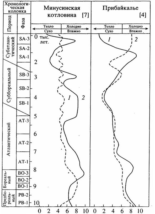 Интерпретация палеоботанических данных и данных радиоуглеродного анализа позволяет выделить в умеренном поясе Евразии три наиболее теплые и сухие фазы голоцена: бореальную – 8900—8300 лет назад (VII тыс. до н. э.), позднеатлантическую (климатический оптимум) – 6000—4700 лет назад (III тыс. до н.э.), среднесуббореальную – 4200—3200 лет назад (II тыс. до н.э.) [Хотинский Н. А., Савина С. С.]. Соответственно в промежутках климат был более холодным и влажным. Для Европейских степей начало таких похолоданий установлено более точно и приходится на 3600, 3100, 2600, 2000 годы до нашей эры [Борисенков Е. П., Кондратьев К. Я.].