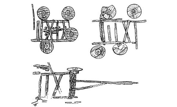 Древнейшая повозка, найденная археологами в городской культуре на юге Туркменистана, датируется второй половиной IV тысячелетия до нашей эры [Кирчо Л. Б.]. Это было громоздкое, неповоротливое сооружение на четырех цельнодеревянных колесах, приводимое в движение парой мощных быков. Но даже в таком виде телега имела явные преимущества по грузоподъемности и прочности по сравнению с волокушами и санями, выполнявшими роль транспорта до изобретения колеса. Не берусь судить каким путем (экономическая экспансия или просто техническое заимствование), но уже в начале третьего тысячелетия несколько усовершенствованный вариант этой повозки оказался в распоряжении культур древнеямной общности (рис. 4), не мало поспособствовав их широчайшему распространению по степным районам Евразии.