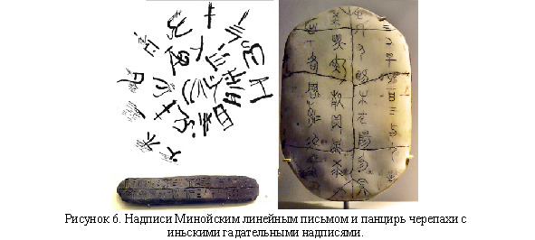 Примерно в это же время на Великую китайскую равнину происходит вторжение кочевых племен, вооруженных колесницами, владеющих развитой бронзоволитейной технологией, и хоронящие своих вождей в богатых курганных гробницах. Пришельцы основали государство Шан (Инь) – археологическая культура Эрлитоу, которая сменила луншаньские памятники эпохи Ся. Помимо сходства сценария и одновременности столь пространственно удаленных событий есть еще один очень интересный момент: многие исследователи отмечают несомненное сходство между дошедшими до нас знаками шанской и минойской письменности (рис. 6), при резком их отличии и от шумерской клинописи, и от египетских иероглифов. Возможно минойская письменность проникла в Степь еще в период расцвета Майкопской культуры, а возможно вместе с металлургами «Страны городов».