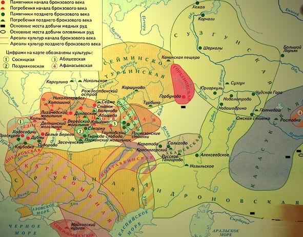 Севернее, в Волго-Уральском регионе развивалась абашевская культура, имеющая тесные культурные и родственные связи с двумя предыдущими, в связи с чем ее часто рассматривают как локальный вариант срубной или андроновской культуры. Отличительной чертой абашевцев был несколько иной состав стада, своеобразная керамика и одна интересная для дальнейшего повествования деталь погребального обряда: их курганы окружались кольцом из выложенных камней. А так, в целом, все три культуры были довольно схожи. Разве, что «имеющиеся данные по составу костных остатков… позволяют с большой долей уверенности говорить о кочевом типе животноводства у населения степной зоны и о придомном типе в составе комплексного хозяйства у отдельных групп населения лесостепной зоны» [Косинцев П. А.].
